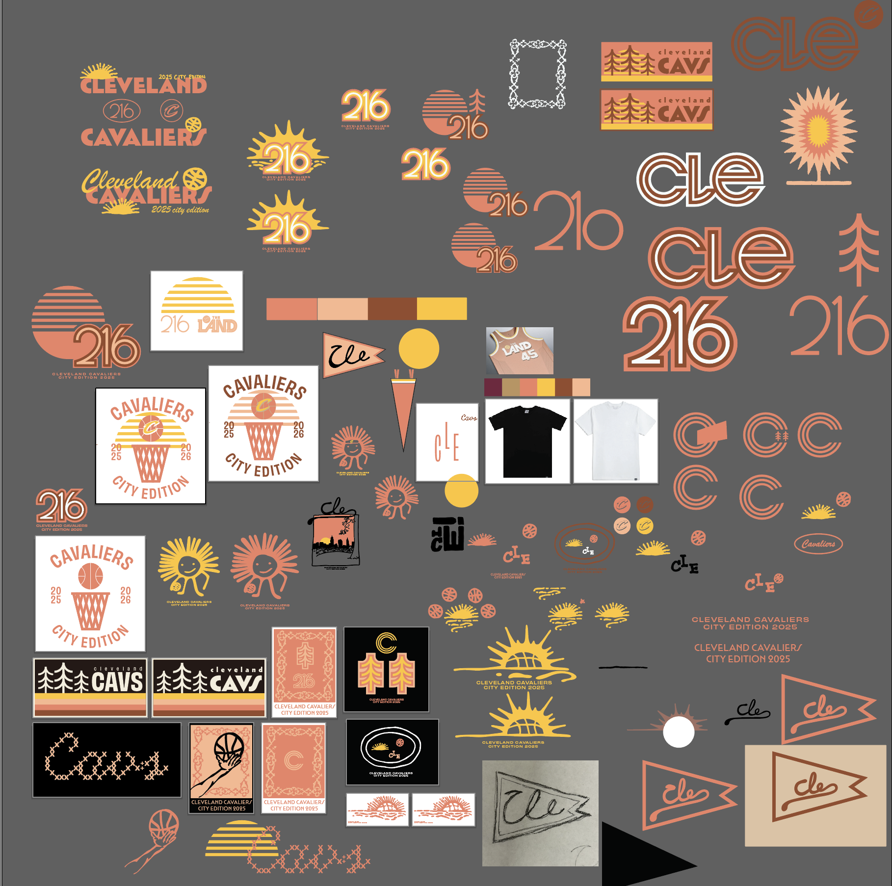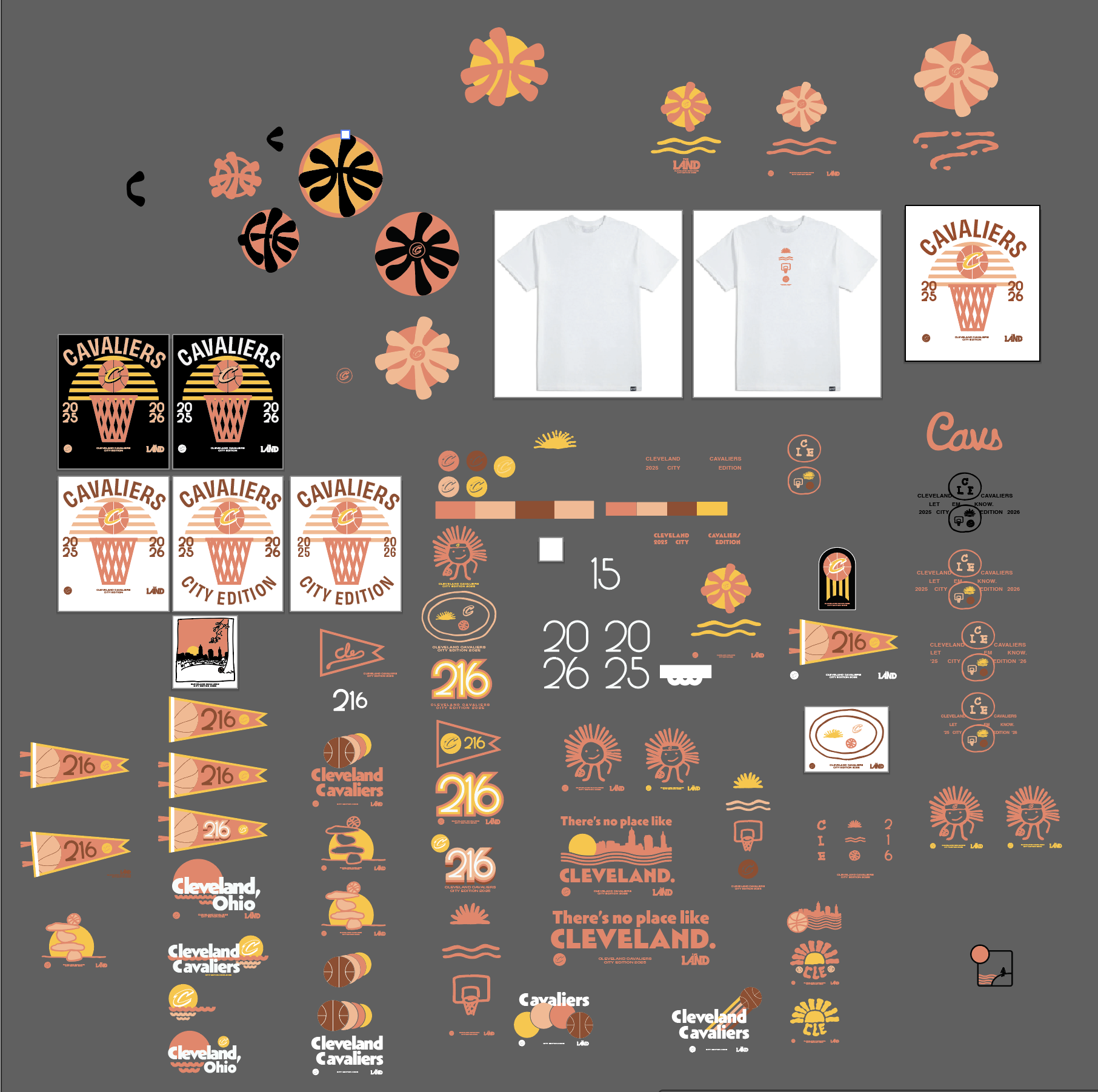 Apparel design for the Cavs 2025-26 City Edition campaign. This year’s theme was the Cleveland sunrises and sunsets that are easily appreciated in the Cleveland Metroparks. Given the color palette and logos, I was encouraged to play and experiment in veins that would connect fans to basketball, Cleveland, and, of course, Cavs culture.